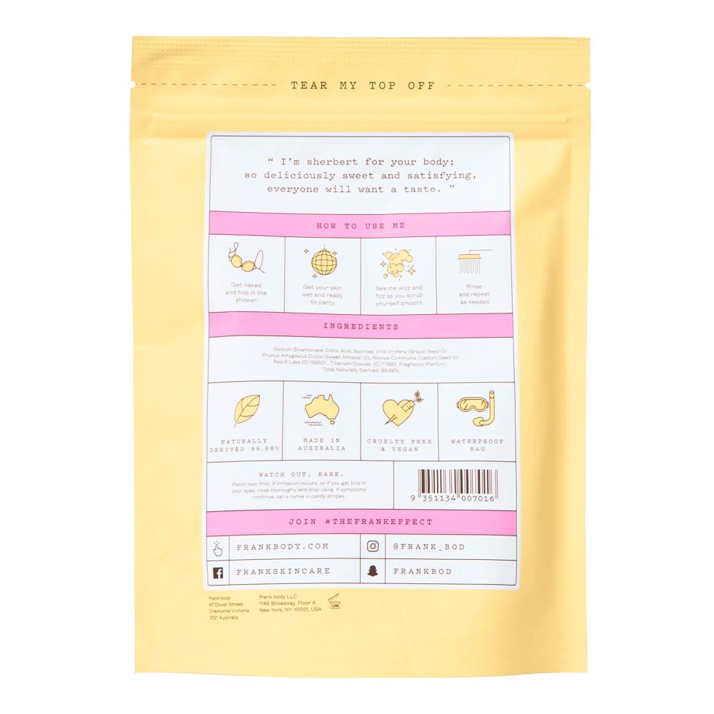 فيزي اسكراب للجسم من فرانك بودي ذو اللون الوردي والكربوني ، الذي يجمع بين فوائد مقشر السكر الأصلي ومتعة الحلوى الفوارة، يتميز هذا المقشر بتركيبته الفريدة التي تحسّن ملمس الجلد وتمنحه نعومة حريرية، وذلك بفضل استخدام مكونات آمنة للبشرة التي لا تسبب أي ردود فعل تحسسية.