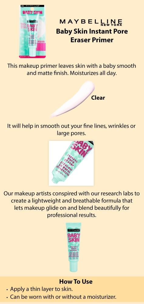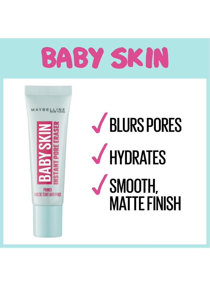 برايمر ميبلين بيبي سكين هو ممحاة® المسام الفورية لمظهر بشرة®تشبه بشرة الطفل ، حيث يساعد في تقليل ظهور المسامات الواسعة وإخفاء الهالات اسفل العينين، يرطب ويحمي ويهيئ البشرة لوضع المكياج بتركيبة خفيفة سريعة الامتصاص.