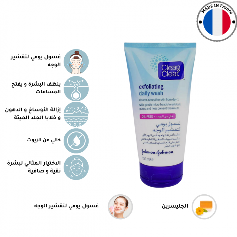 غسول مقشر يومي خالي من الزيوت لتقشير الوجه من كلين اند كلير، ينظف البشرة و يفتح المسامات بحبيباته الصغيرة الناعمة. له تركيبة تعمل بفعالية على إزالة الأوساخ و الدهون و خلايا الجلد الميتة التي تسد المسامات و تؤدي إلى ظهور البقع و الرؤوس السوداء. الاختيار المثالي لبشرة نقية و صافية.