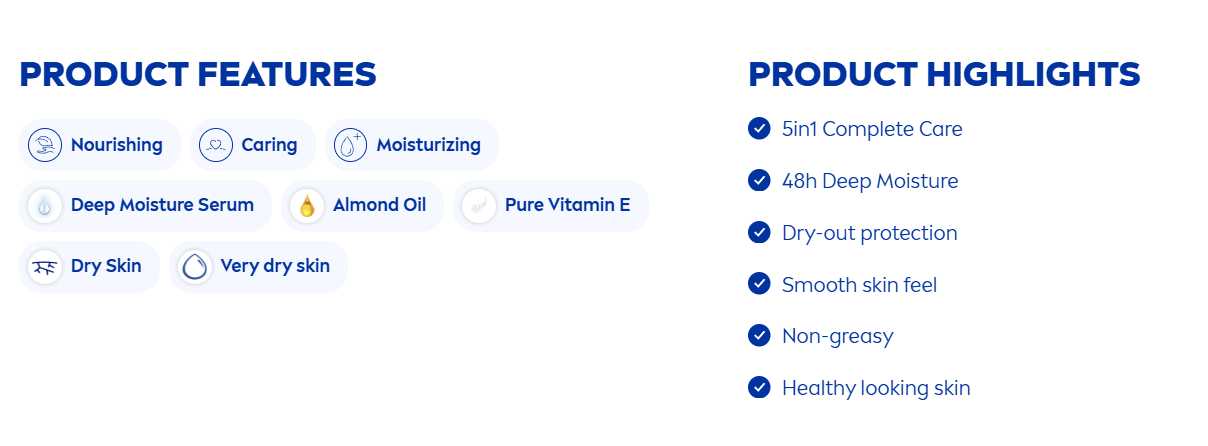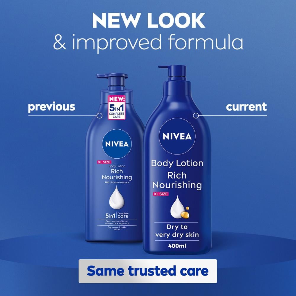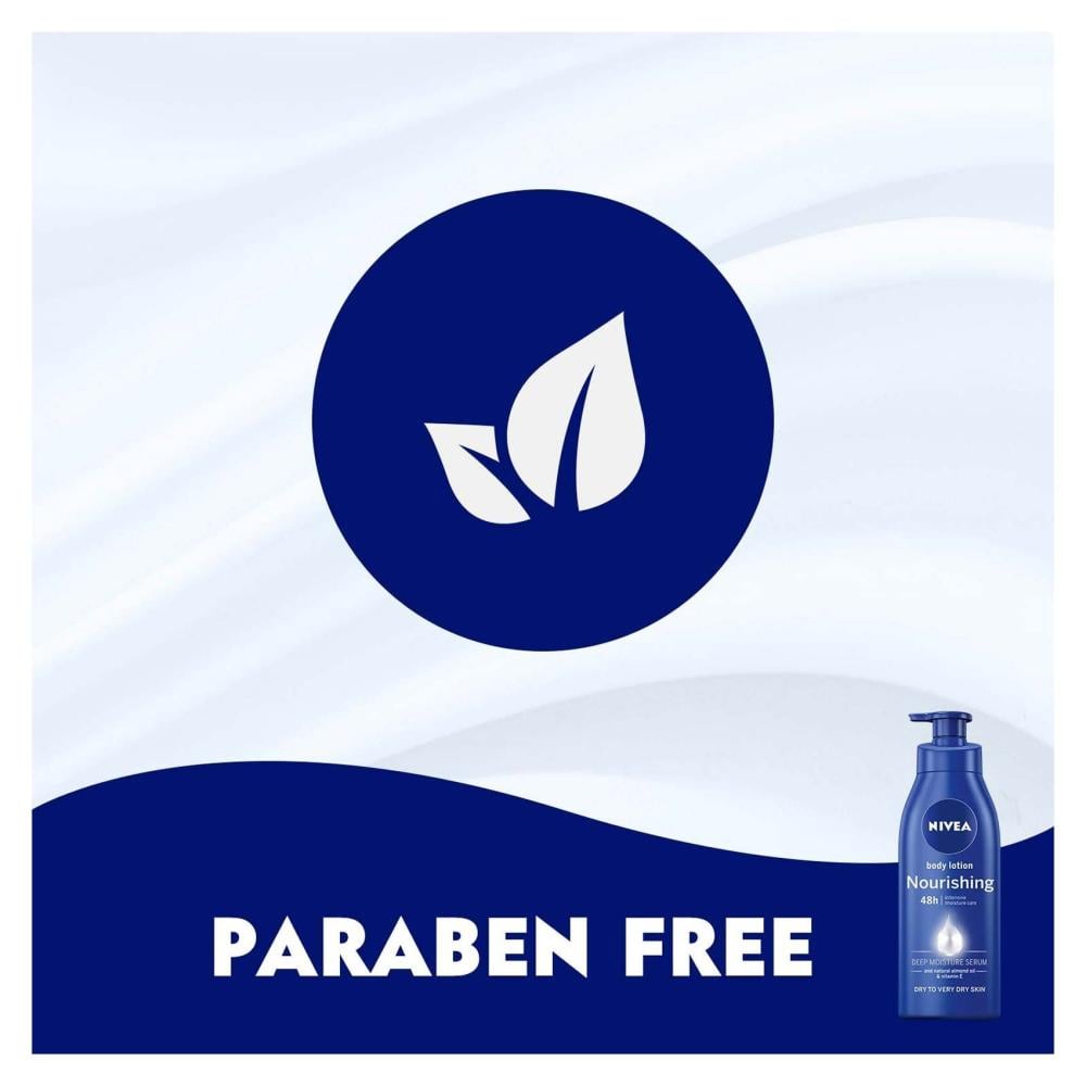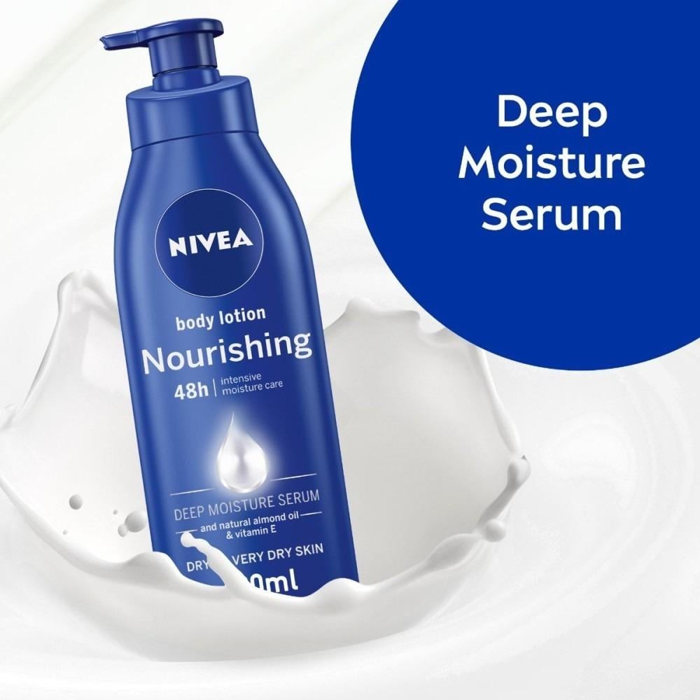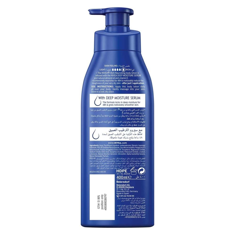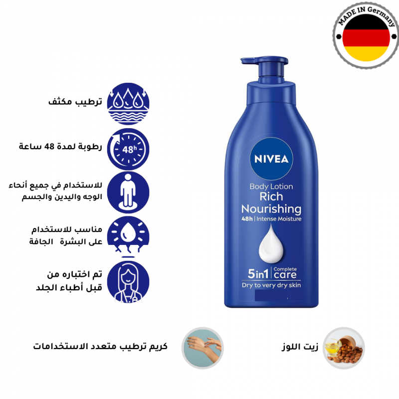 لوشن نيفيا الغني يعيد ترطيب الجلد الجاف والشديد الجفاف ويمنح البشرة نعومة وملمس حريري، مع تركيبة سريعة الامتصاص غير دهنية. تحتوي على سيروم الترطيب العميق لتقليل جفاف بشرتك، غني بزيت اللوز الذي يوفر تغذية مكثفة ويوفر انتعاش وترطيب لمدة 48 ساعة لنتيجة بشرة ناعمة وسلسة ومرطبة بعمق ..