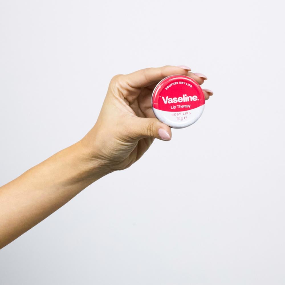 • اغمسي إصبعك في مرطب الشفاه فازلين الوردي واستخرجي ما يكفي لتغطية الشفاه.